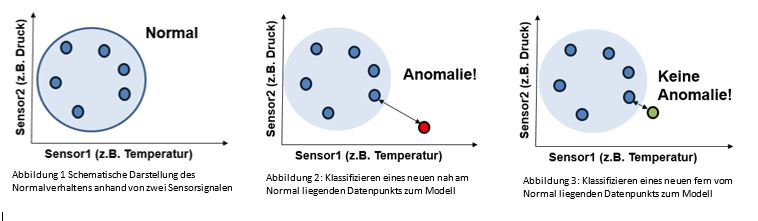 Die Entfernung zweier Datenpunkte kann hierbei zum Beispiel durch die euklidische Distanz ermittelt werden. Wird ein Datenpunkt aufgenommen, in dem die Maschine sich in einem fehlerhaften Zustand befindet, ist dieser Datenpunkt, wie in Abbildung 3 zu sehen, weiter vom Normalzustand entfernt. Dieses deutet auf eine Anomalie hin.