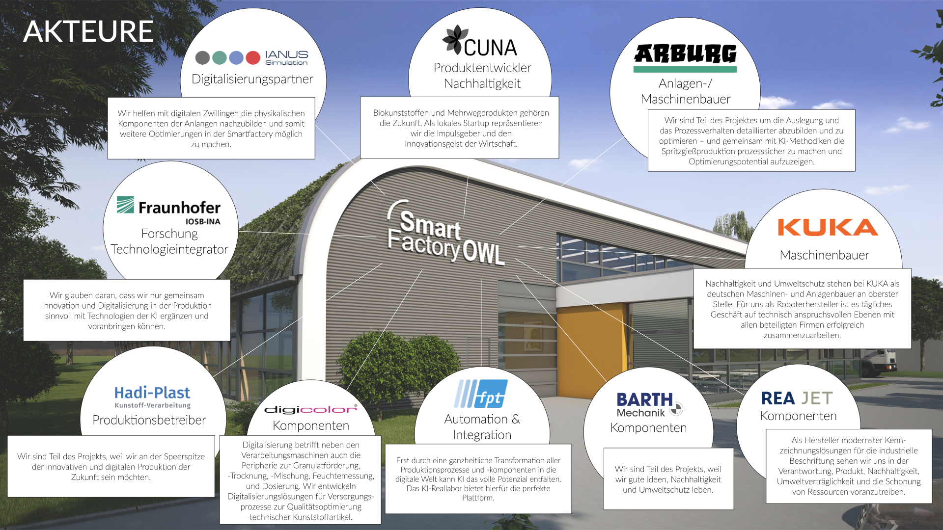 Durch innovative Technologien vom Fraunhofer IOSB-INA kann die Fertigung über einen Webshop indivduell gestartet und gesteuert werden. Losgröße 1 Fertigung bei gleichzeitig hochgradigem Automatisierungslevel ist möglich. Zugleich ermöglichen Digitale Zwillinge auf Grundlage der Industrie 4.0 Verwaltungsschale eine umfassende Vernetzung aller Einzelkomponenten und schaffen so eine interoperable Kommunikation für die flexible, agile und hochgradig vernetzte Produktionsanlage.